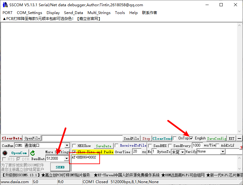 sscom32will be a nice choice. The language is set to Chinese by default. Check the checkbox to change to english and set baudrate to 512000.