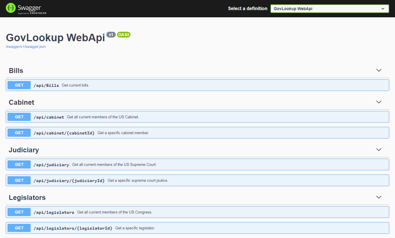ASP.NET Core WebApi GovLookup Web Api to retrieve data for U.S. Legislators, Cabinet and Judiciary. Demo Try out the demo! Versions Asp .Net Core : 8.0 AutoMapper : 12.0.1 Dapper : 2.1.28 Entity Framework Core : 8.0.1"