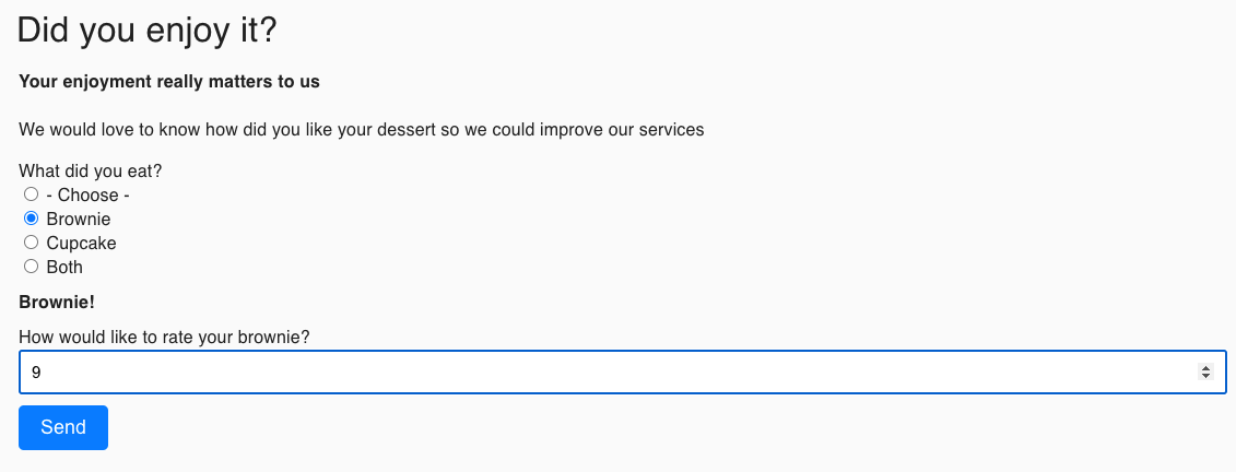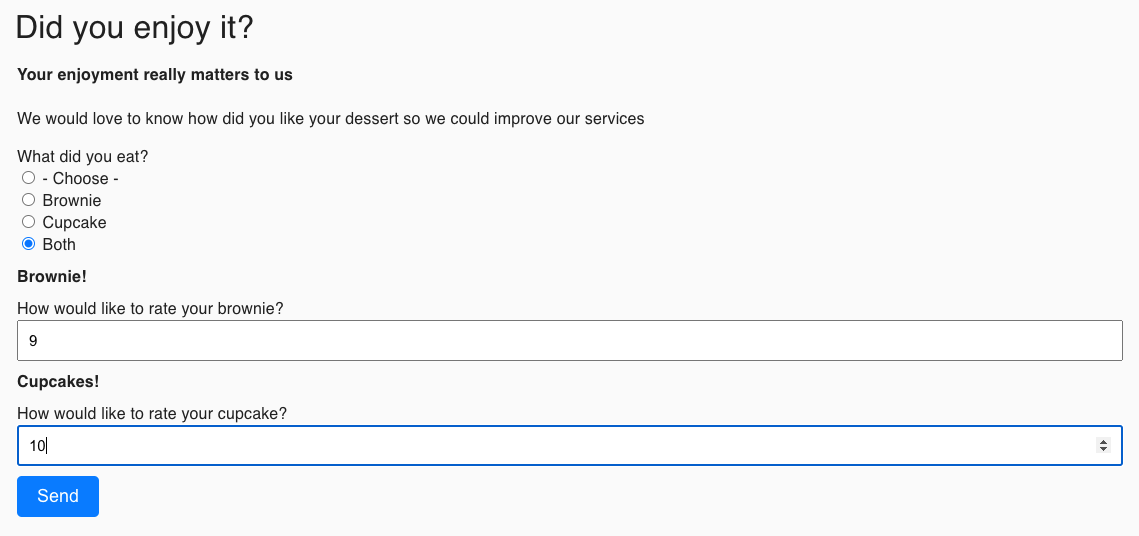 This example has a radio list select where customer can choose whether they ate the brownie, cupcake or both. If customer has eaten brownie or both he/she is queried who would the rate the brownie and if the customer has eaten the cupcake the same thing is queried about it.