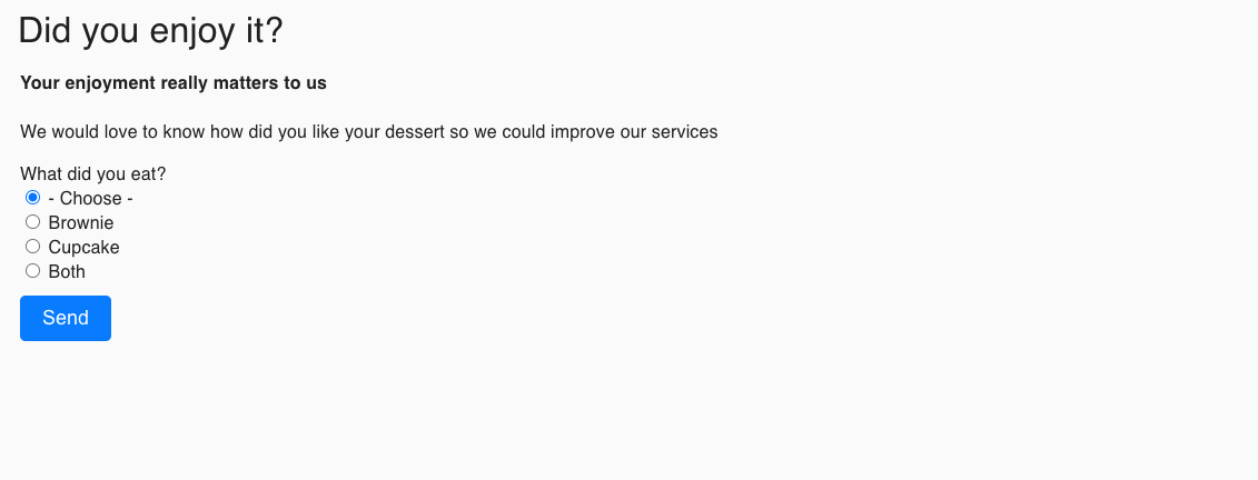 "html": "<b>Your enjoyment really matters to us</b><br/><br/><p>We would love to know how did you like your dessert so we could improve our services</p>"