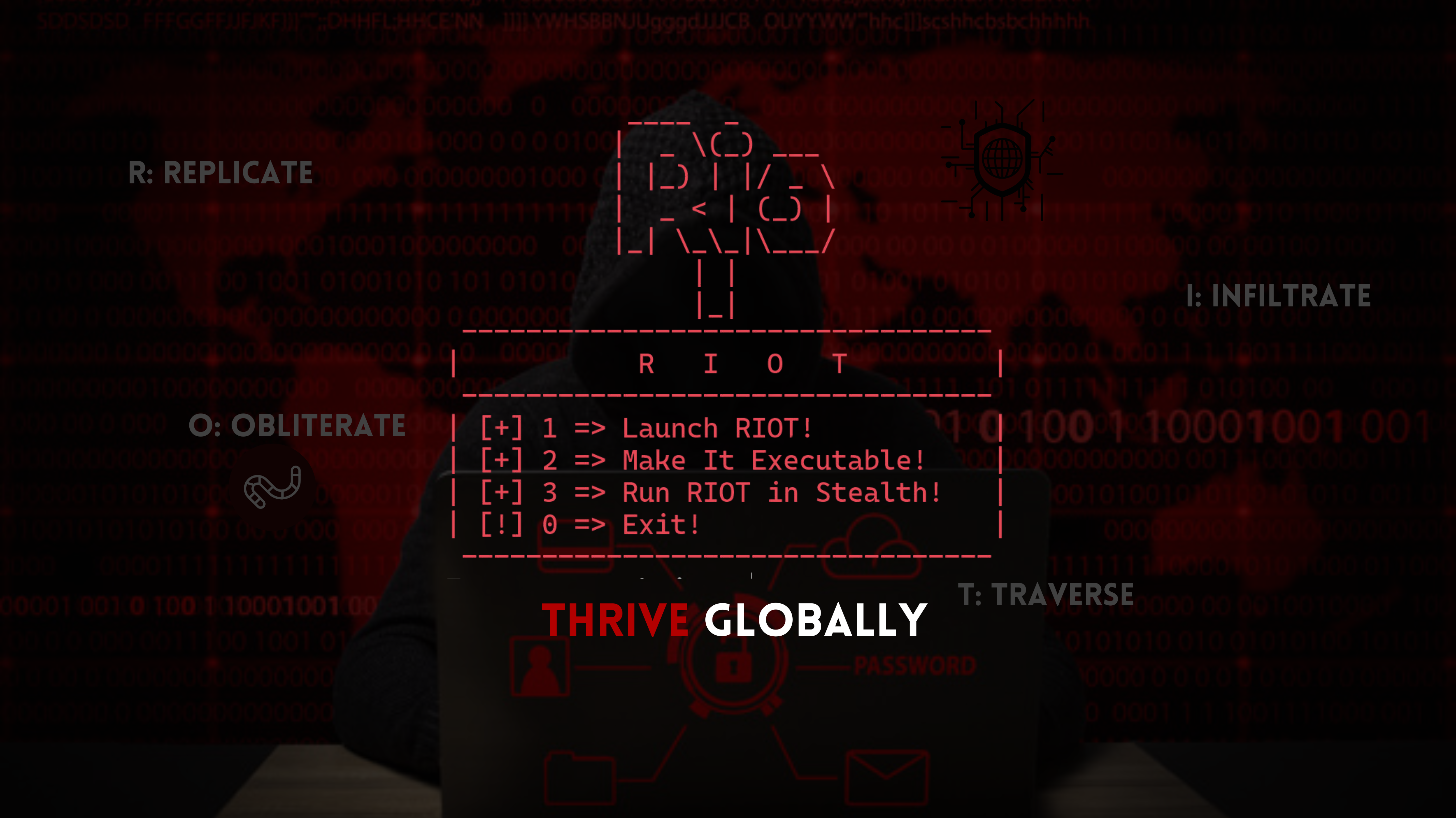RIOT (Replicate Infiltrate Obliterate Traverse) is a malicious worm program designed to replicate itself across directories and create copies of files. It can run in stealth mode and can be compiled into an executable.