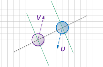$$ m_1 * V_x + m_2 * U_x = m_1 * V_x' + m_2 * U_x'; $$ 并假定两球碰撞是完全弹性碰撞, 两球质量相等$m_1=m_2$ , 依据基础物理知识篇的结论.$$ V_x' = \frac{[(m_1-m_2) * V_x + 2 * m_2 * Ux]}{(m_1 + m_2)} = U_x; \ Ux' = \frac{[(m_2-m_1) * U_x + 2 * m_1 * V_x]}{(m_1 + m_2)} = V_x; $$ 在X轴方向, 两球交换速度, 而在Y轴方向, 两球分速度不变.