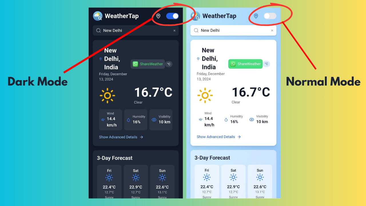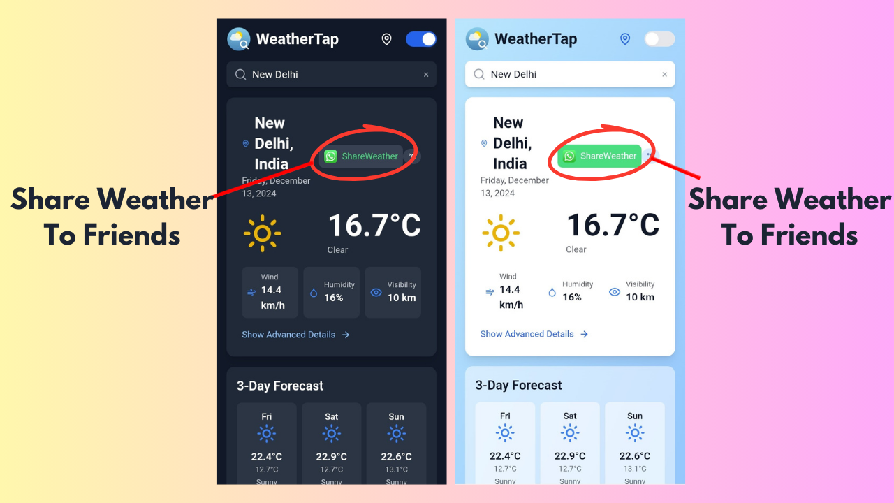 - Social Sharing: Share weather information via WhatsApp