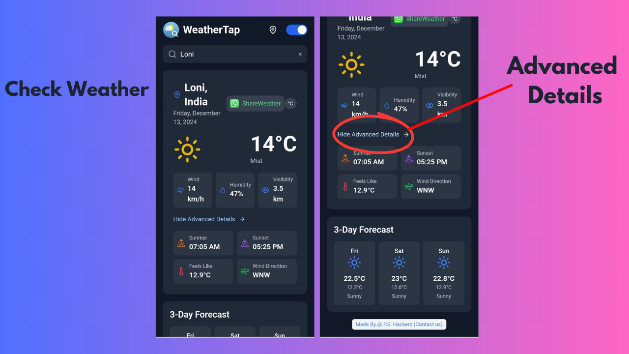 - 3-Day Forecast: View detailed weather predictions for the next three days