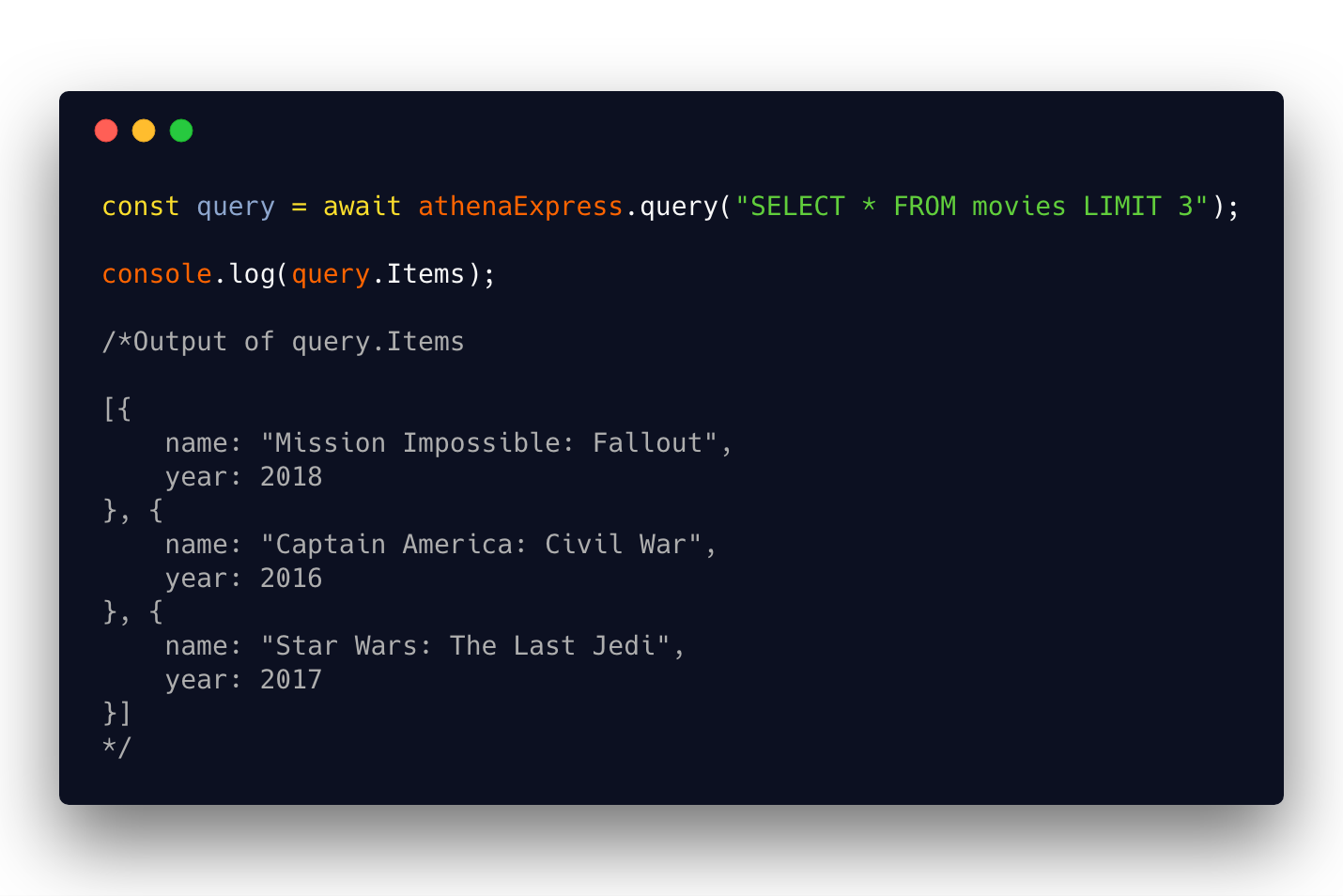 athena-express simplifies integrating Amazon Athena with any Node.JS application - running as a standalone application or as a Lambda function. As a wrapper on AWS SDK, Athena-Express bundles the following steps listed on the official AWS Documentation: