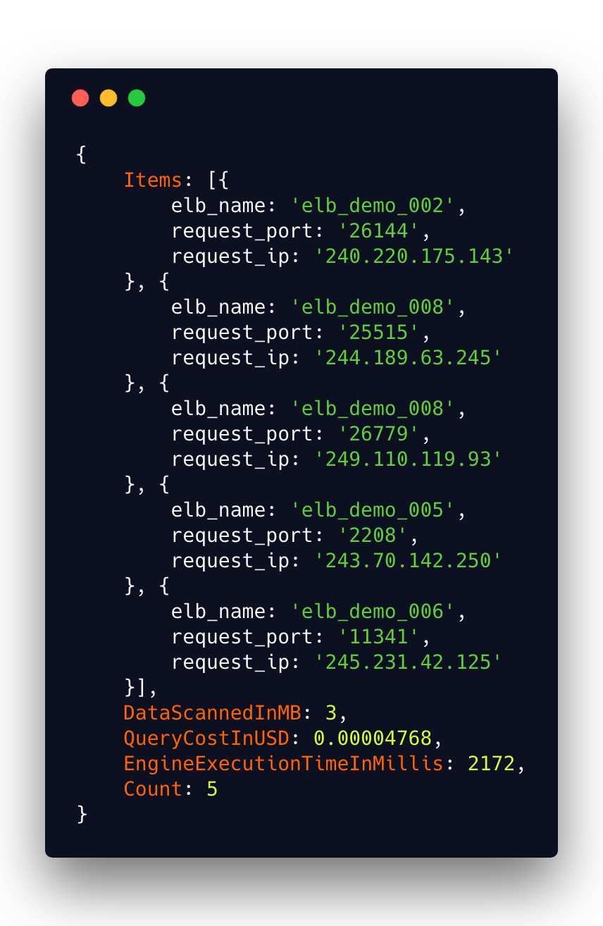 sql: "SELECT elb_name, request_port, request_ip FROM elb_logs LIMIT 3",