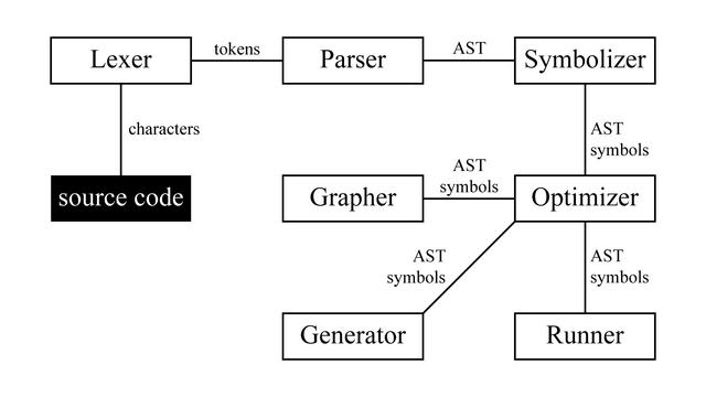 - Generator - Produces C code using the symbols and AST
