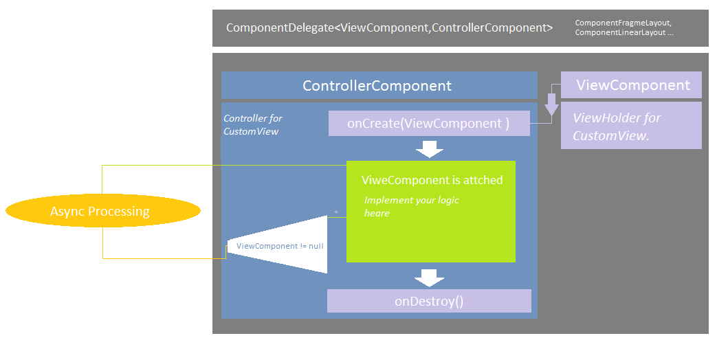 Create class CustomControllerComponent extend it from ControllerComponent class, inside onCreate() method receive non null CustomViewComponent. In this class implement your custom view's logic.
