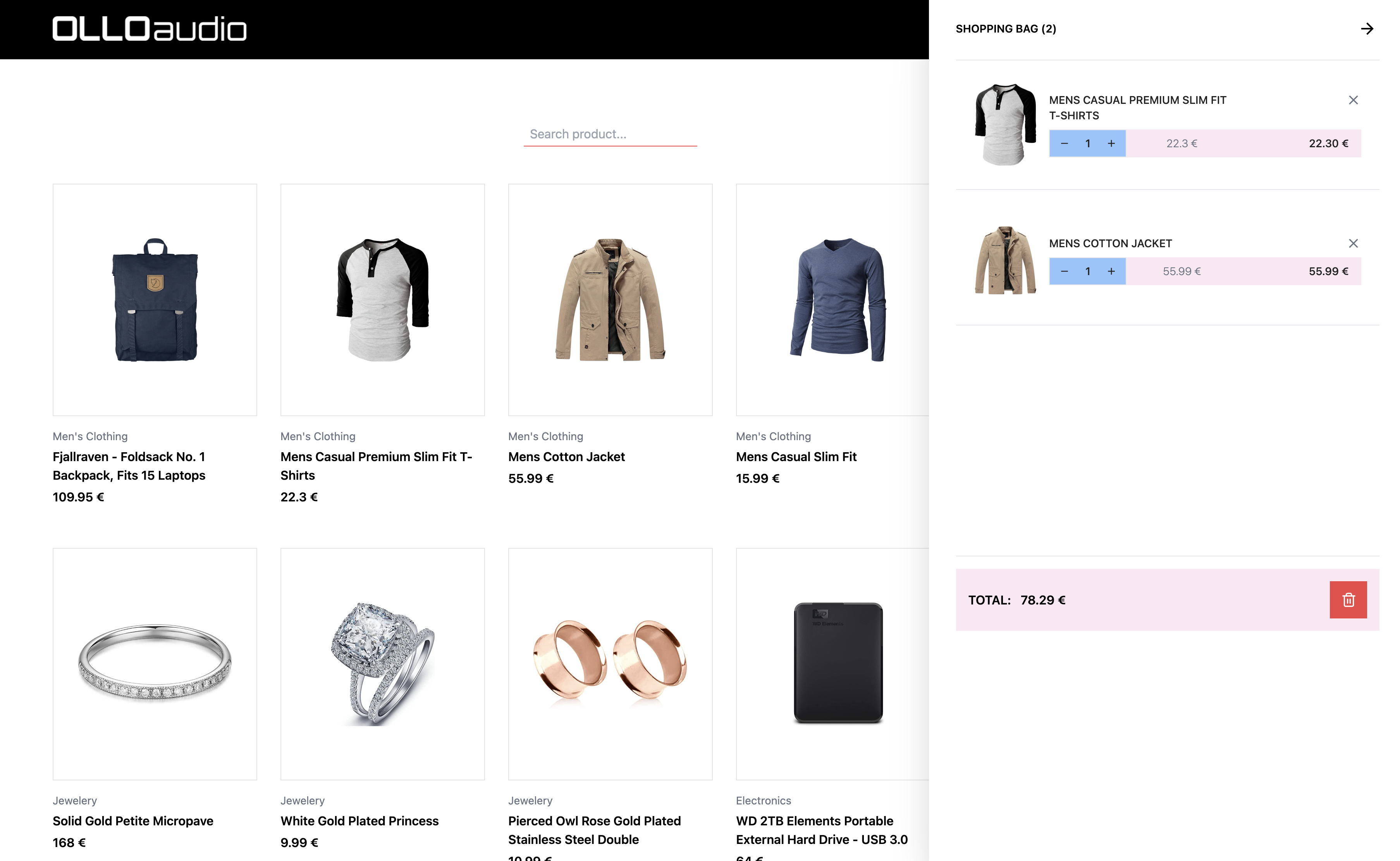 When you click in the cart icon it appears a sidebar containing all the products in the cart where you can add or subtract items from the list as well as removing certain items from cart or clear the full cart.