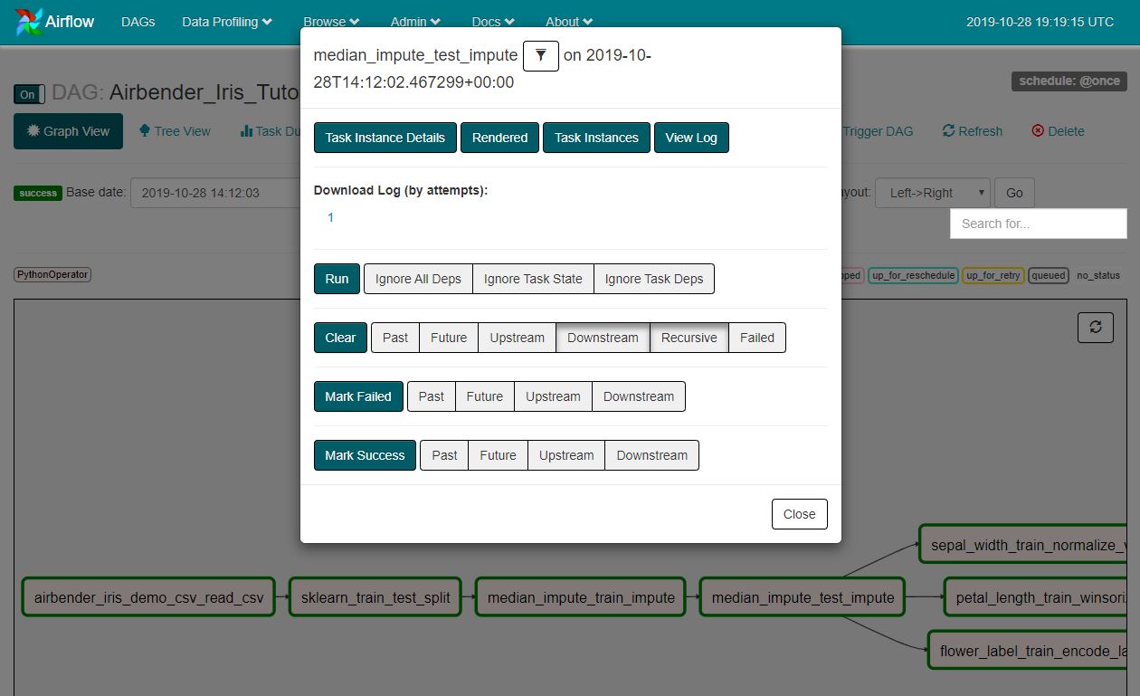 At this point, our job is finished. All we need to do is place this file into our airflow dag directory, turn on Airflow's scheduler and webserver, and watch the experiment run. While the experiment is running, you can track the progress of the DAG in real-time by with Airflow's tree or graph view, shown below.