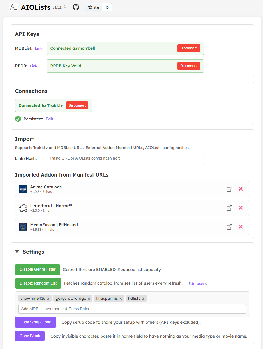 - Share Your Setup: Generate a shareable hash of your AIOLists configuration (list order, names, imported addons) to share with others.