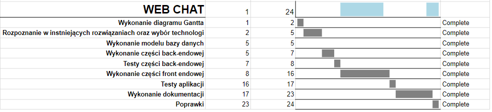 Pierwszym krokiem milowym było stworzenie widoku pokoju czatowego w strukturze React.js. Następnie dodana została część serwerowa, napisana przy użyciu Node.js. Następnie dodany został wzorzec projektowy „Flux", a co za tym idzie biblioteka Redux.js, idealnie pasująca do jednostronnie przepływającego strumienia danych. Następnie stworzono moduł w części funkcjonalnej za pomocą biblioteki obsługującej WebSockets. Dzięki temu uzyskano połączenie użytkowników w czasie rzeczywistym. Udało się również zaimplementować część testów jednostkowych dla poszczególnych widoków. Na końcu stworzony został moduł logowania po stronie front-end.