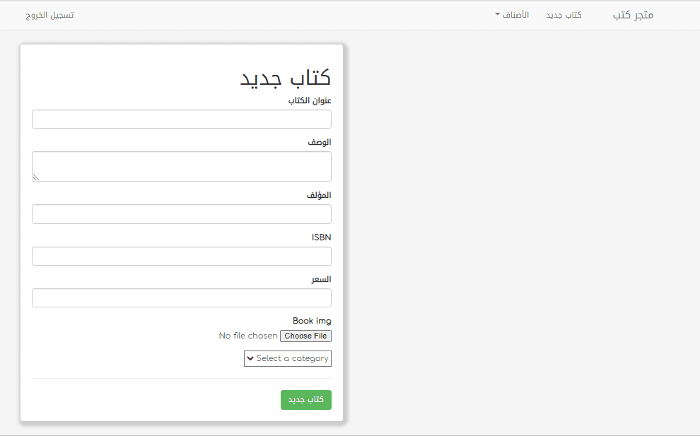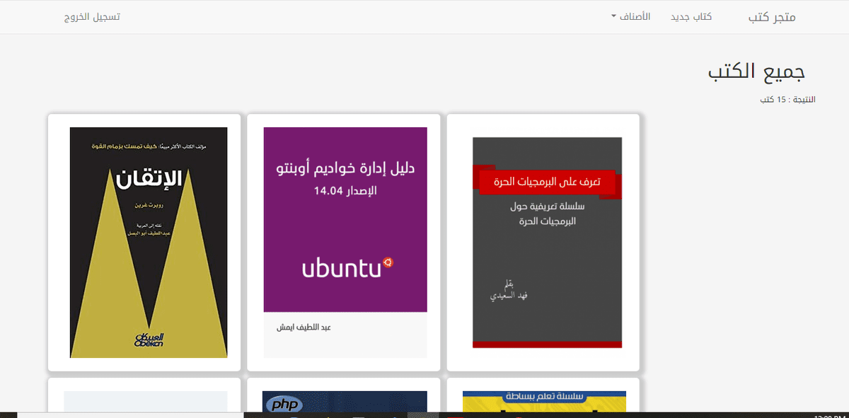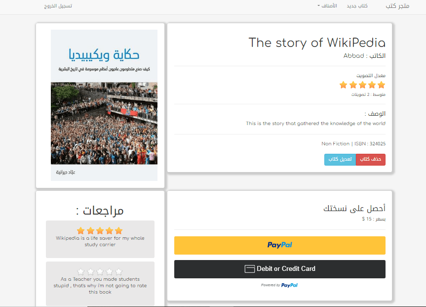 متجر كتب بسيط كمشروع تخرج وتطبيق للمعارف التي تم التطرق إليها في الدورة يحتوي على صفحة رئيسية وصفحة خاصة بكل كتاب بإمكان المستخدم إضافة كتب أو كتابة مراجعات وإضافة تقييمات للكتاب ، كل كتاب لديه متوسط عدد التقييمات بناءا على عدد التقيمات التي تم إضافتها بالإضافة لكل من عنوان الكتاب ، إسم المؤلف ، وصف الكتاب ، رمز ISBN ، و أخيرا سعر الكتاب . بإمكان الزائر إقتناء الكتاب المرغوب عبر زر الباي بال أو استعمال أحد بطاقات الدفع الالكترونية.