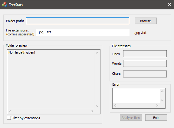 Out first step is to use the "Browse" button and choose a folder to be analyzed using the folder choosing dialog. After that, the path is updated and so is the file list. Also, the analyze button is now available: