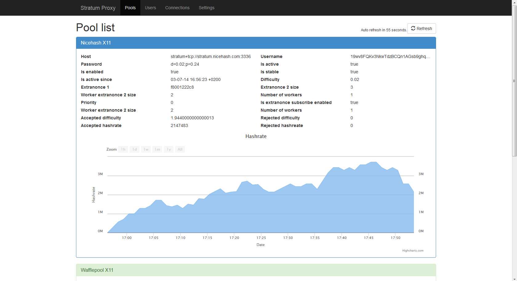 Java implementation of a stratum->stratum/HTTPGetwork proxy with a Web GUI and some pool switching strategies (PriorityFailover, WeightedRoundRobin). Simple to install and configure.