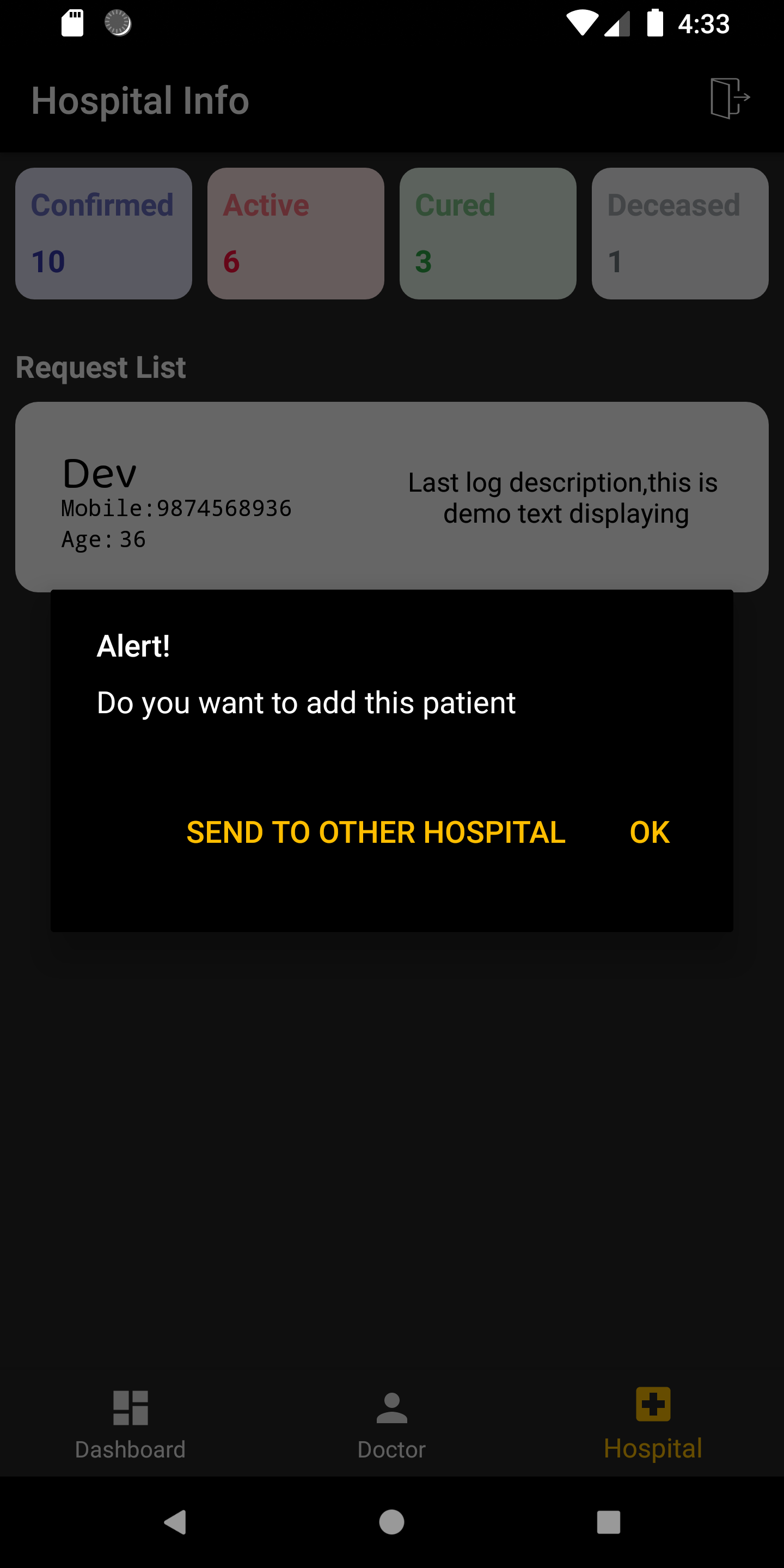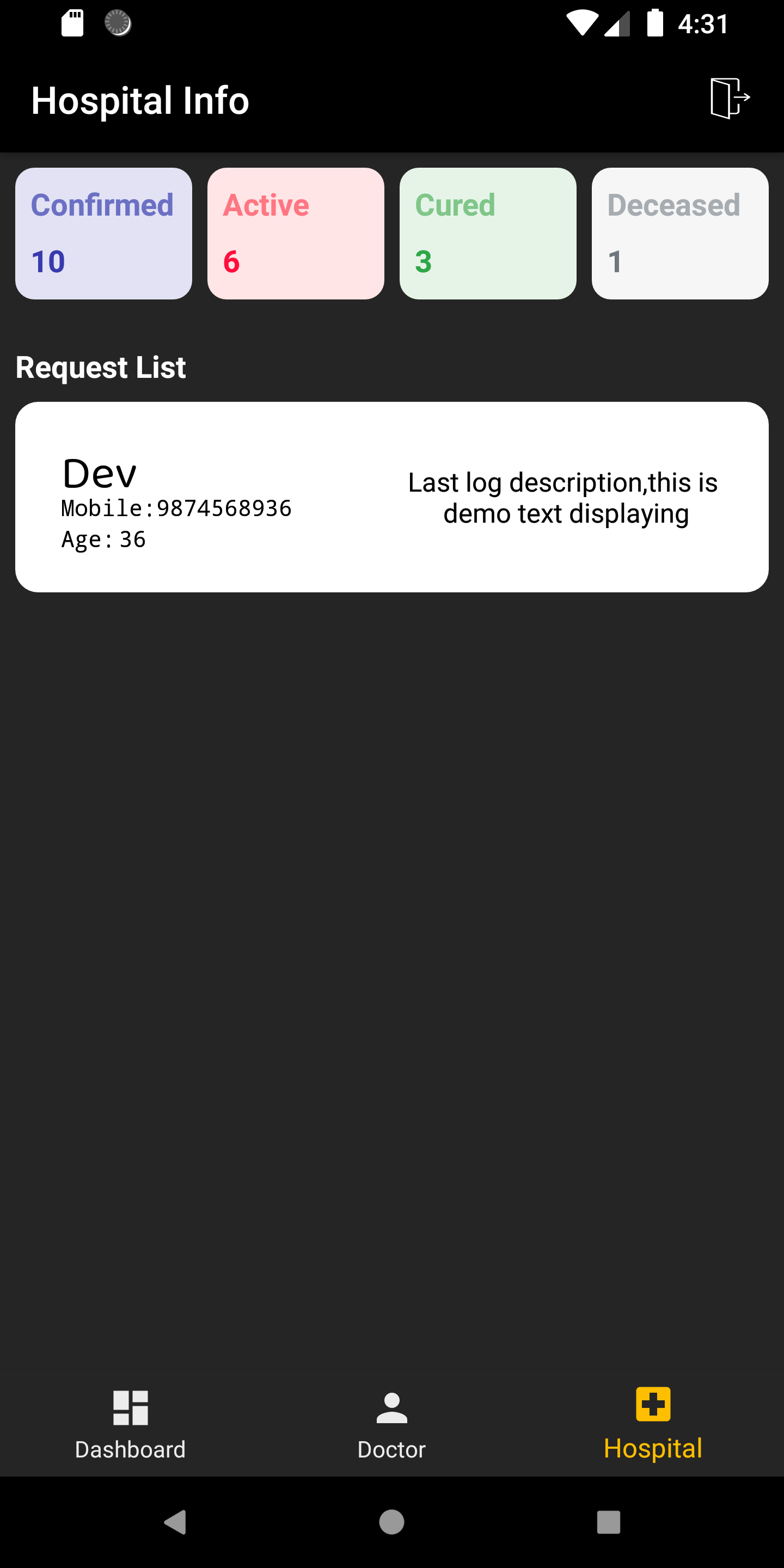 - Hospital: It will show the current status of that hospital for example the number of active, cured, confirmed and deceased cases. It will also show the request made by other people for appintment throught web app, with an action of adding him/her to our hospital or forward request to another.