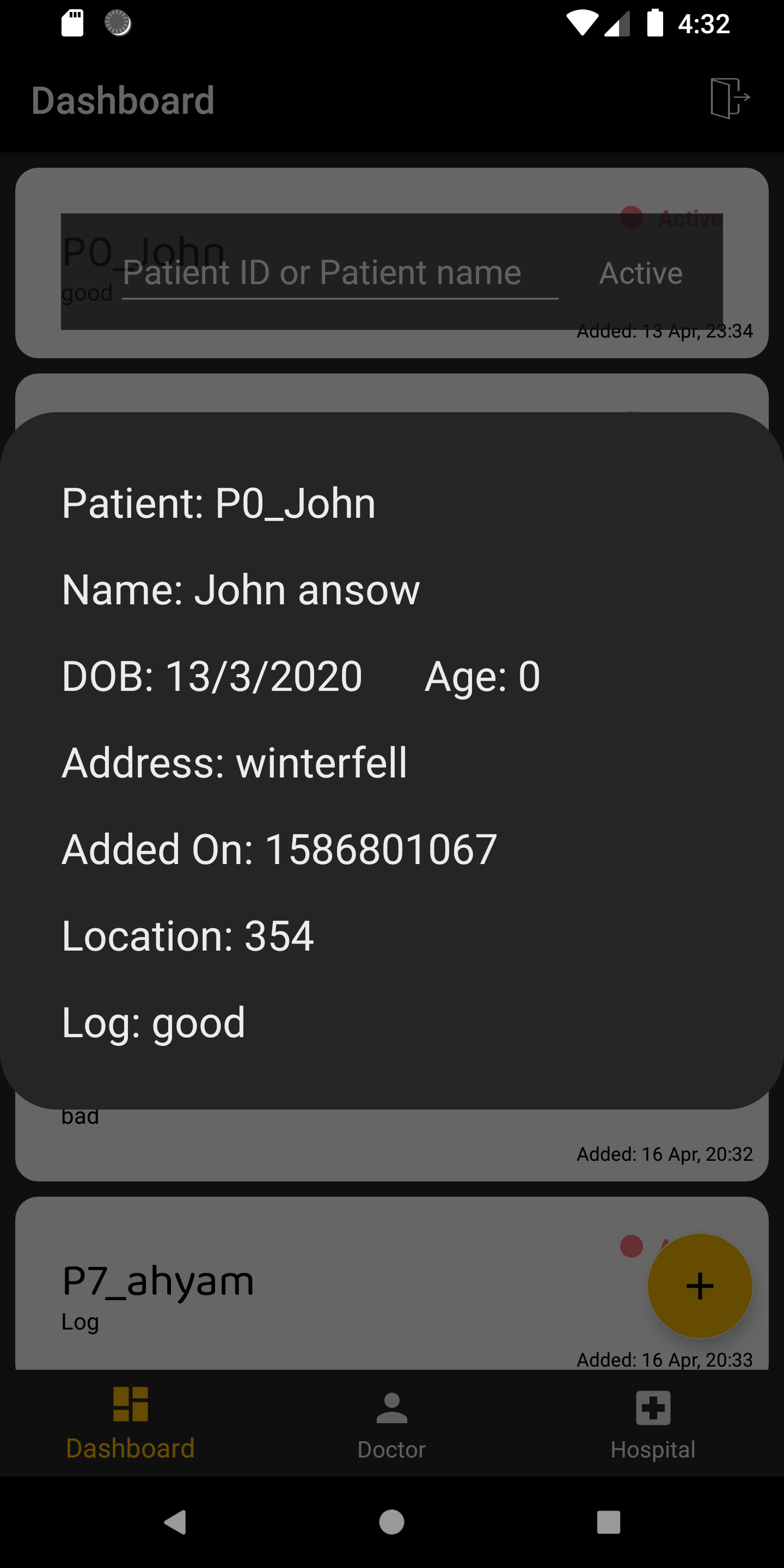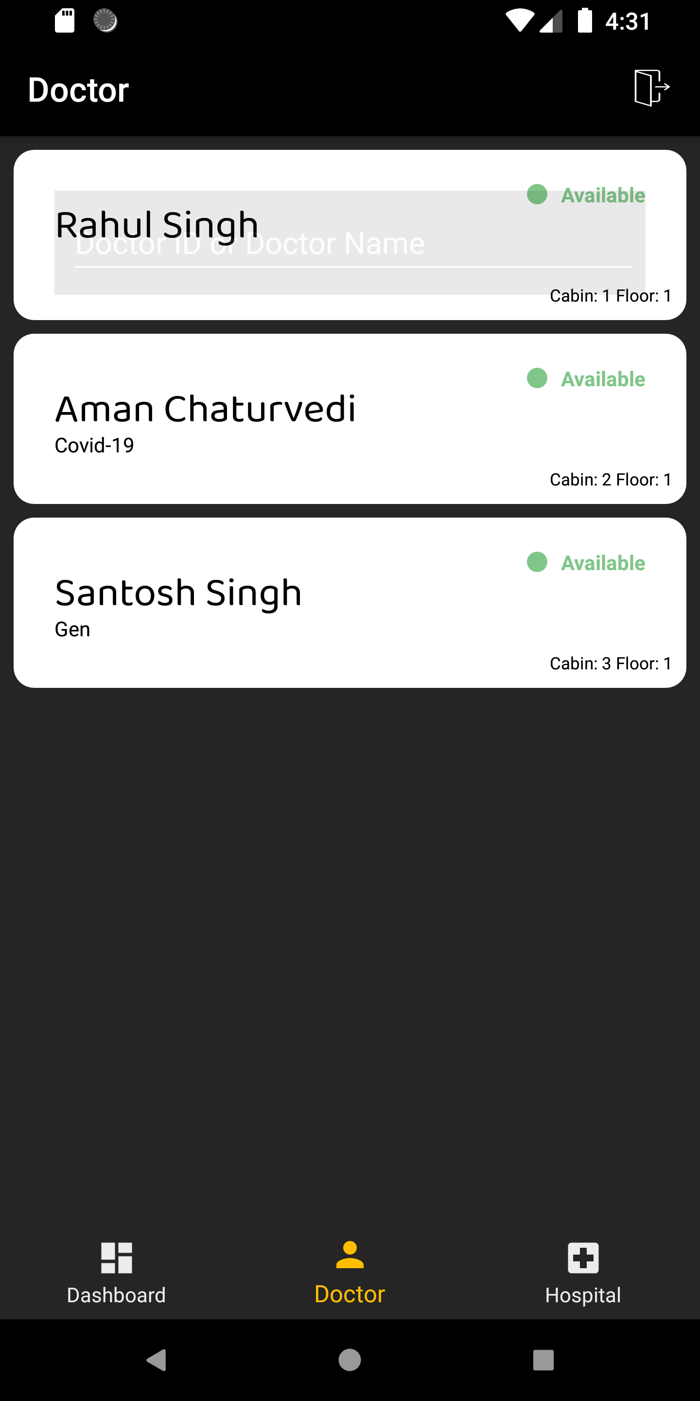 - Doctor: Whenever the new patient is added then it is alotted to a particular doctor. Doctor can enter their verification ID and then check each patients and write the recent log of each patient. The changes would be updated for each patient. For verification ID doctors have to enter their unique id provided by the authority.