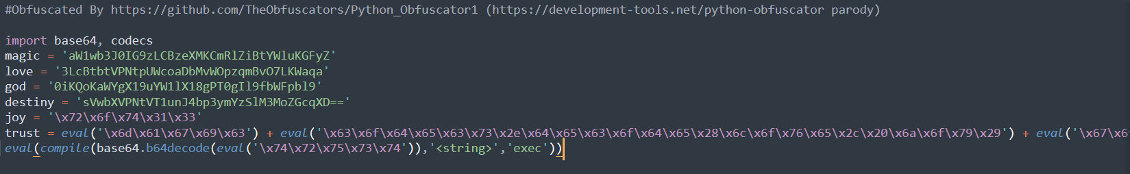 Python_Obfuscator1 π What it does ? It's a simple parody of this online Python Obfuscator, it does the exact same job and it's open-source. π₯ Preview YouTube video π Stars [20 Stars] Tweaks to troll people