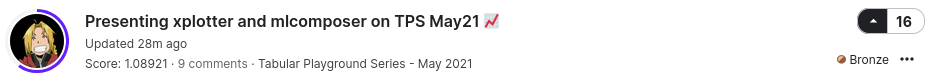 - Still on Kaggle, there is the excellent Presenting xplotter and mlcomposer on TPS May21 that is part of the Tabular Playground Series competition that allows users to user data to explore techniques and knowlege. On the linked notebook, the user Thiago Panini explored some tools of