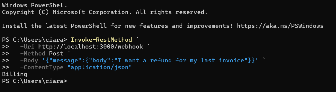 Runs in demo mode — no credentials required; logs detected intent and returns label in HTTP response