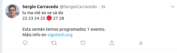 metagroup-schema-toolsparaparsear o vigotech.jsonen lugar dovigotech-generated.json(asi pode obter todos os próximos eventos de un grupo en lugar de só seguinte, o que é útil para os resumos semanais e mensuaisvariable EMULATE_TWEET en .env para que envíe a consola o contido do tweet en lugar de