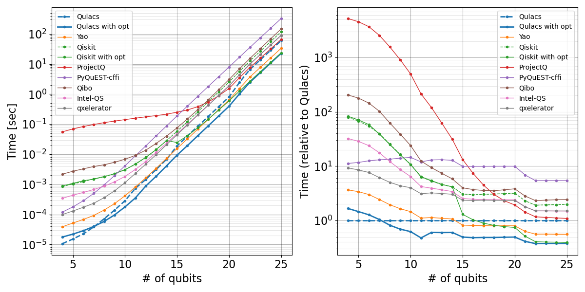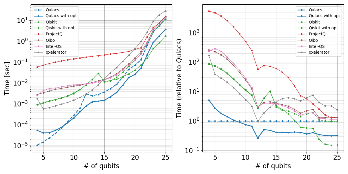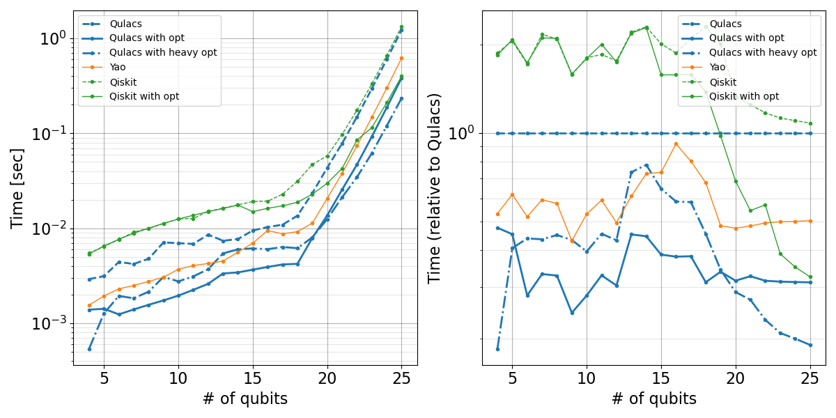 Note that the plots with names ending with "opt" and "heavy opt" perform circuit optimization for fast simulation, where the time for optimization is included in the execution time.