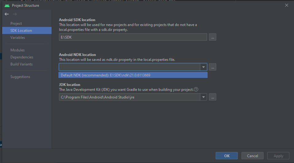 Select Android SDK, check NDK (Side by side) and click OK. It will download and install