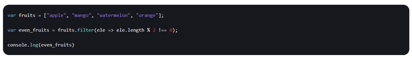 var even_fruits = fruits.filter(ele => ele.length % 2 !== 0);
