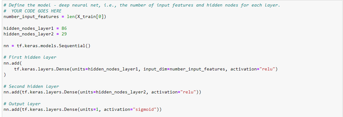 Since funding relies primarily factors such as success and ability to pay back (related sometimes), we decided the target for our model is success since it is charity based. To reach our output, we initially included all data but binned 2 columns: classification, and application type to minimize observation errors. Once completed, it was standard procedure with splitting the data set, scaling, and then fitting the data. Our initial neural network is shown below. Data was also saved every 5 epochs.