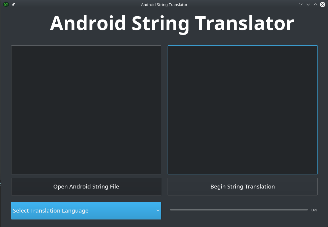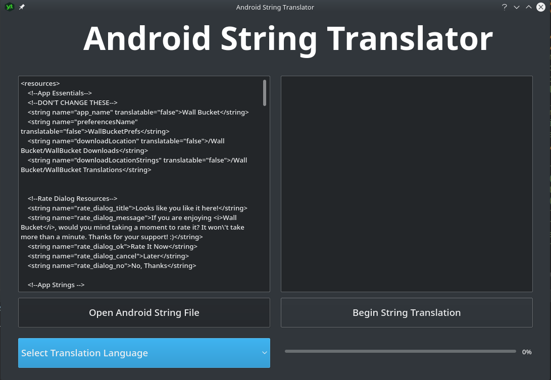 The main goal of the Application is to provide free and easy to use string translation service to new Android Developers who want their app to be localized and don't have a lot of money to spend on online translation services.
