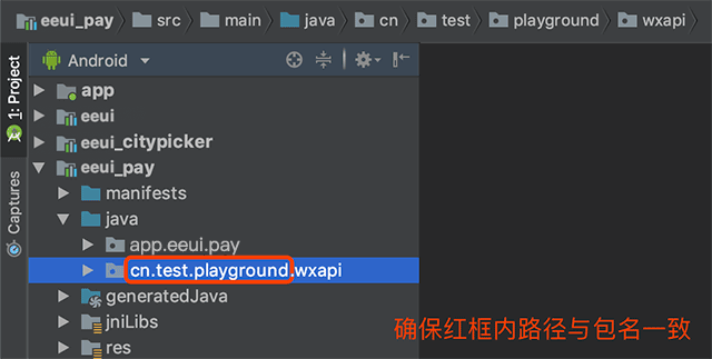 在创建项目的时候**默认已经配置好**路径了,但是如果开发中修改过包名则需要确保以下路径名称与包名一致,否则用户付款完成后无法重新唤起APP。
