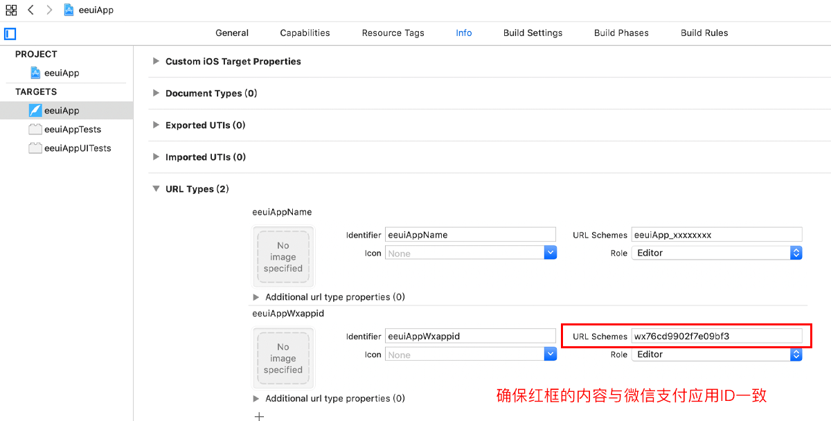如果已经按上面参数配置配置好的话,在编译npm run [serve|dev|build]项目的时候**系统已经自动生成**理论上无需手动设置,但是真正打包项目的时候需要确认设置Info>URL Types,否则用户付款完成后无法重新唤起APP。