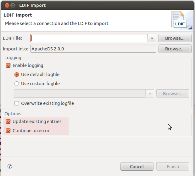 After creating the partition, start the server, by right clicking the icon in the bottom left corner and click "Run". After it starts, right click again and click "Create a Connection". this will create a connection to the LDAP server you just created. In the top left part of the screen you will see the connection and a globe icon that says "o=dev.provider-directories.com,dc=hpd". Right click on this and select "Import" and then "Import LDIF" files to get to the LDIF Import dialoge. Be sure to check the "Update existing entries" and "Continue on error" as shown below.