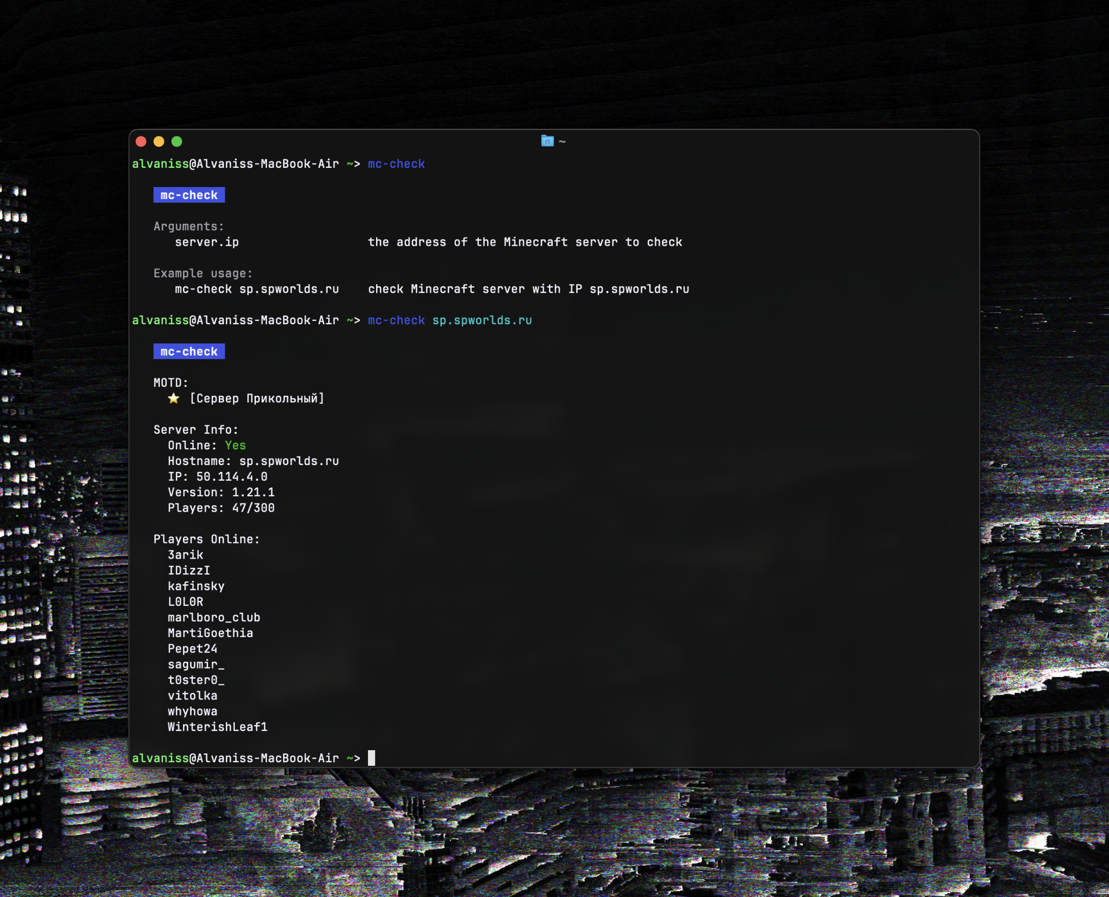 mc-check is a command line tool that allows you to quickly get a lot of information about the Minecraft server you need. The information you get is similar to what you see when you add a server to the server list in the game, but in a more convenient format.