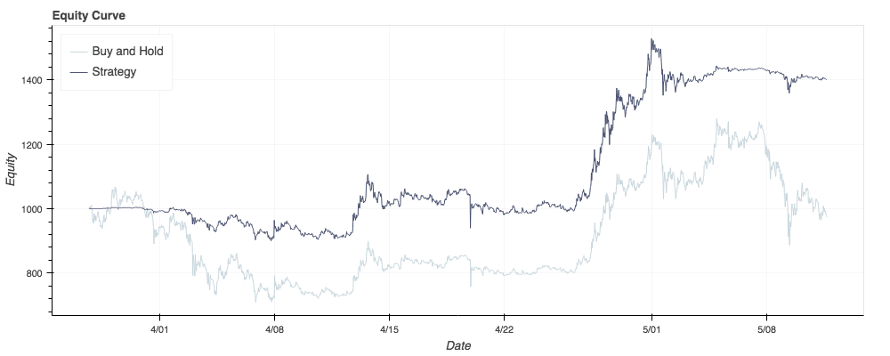 You can visualize the performance of your strategy by comparing the equity curve with a buy and hold baseline. The equity curve simply tracks your account value throughout the backtest and will optionally show where your algorithm made its trades including longs, sells, shorts, and covers.