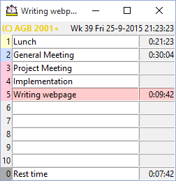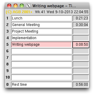 TimeKeeper Utility to keep track of time for different tasks and projects. For more information, see http://www.anne-gert.nl/projects/timekeeper/.