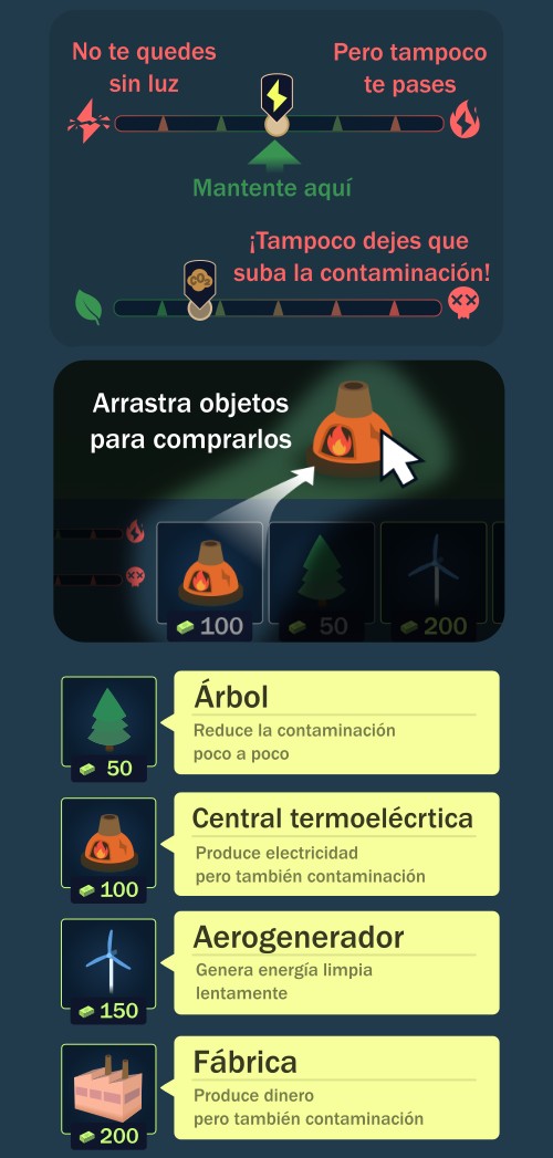 Poder Solar is a game about supplying a city with electricity during the night, while trying to not create too much pollution.
