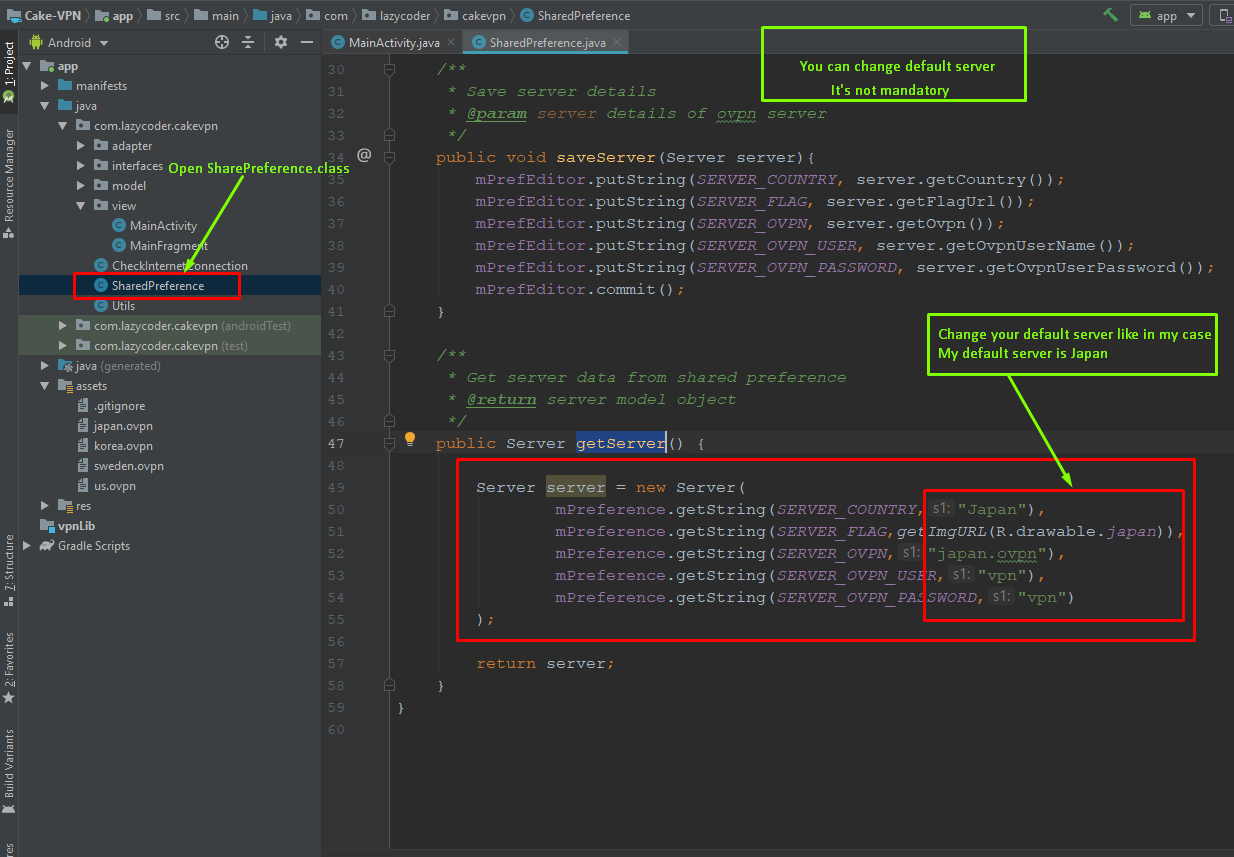 - [!Optional] At Last go to SharedPreference.class and find the "getServer()" method there update default server information.