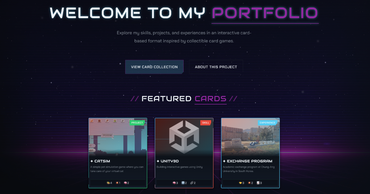 - Interactive Card Collection: Projects, skills, and experiences represented as collectible cards