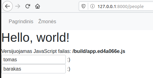 Čia viena iš pavyzdžių, kaip galima panaudoti išorinę bilbioteką, kad mūsų kodas būtų paprastesnis. Kad kodas veiktų, paleidžiame per scripts/frontend.sh yarn watch Patirikrinimui: http://127.0.0.1:8000/people Patirkinimui, atsidarome Naršyklės console langą Turėtų būti kažkas į Object { "build/app.css": "/build/app.css", "build/app.js": "/build/app.js", "build/runtime.js": "/build/runtime.js", "build/vendors~app.js": "/build/vendors~app.js" } Dokumentacija: https://www.npmjs.com/package/axios
