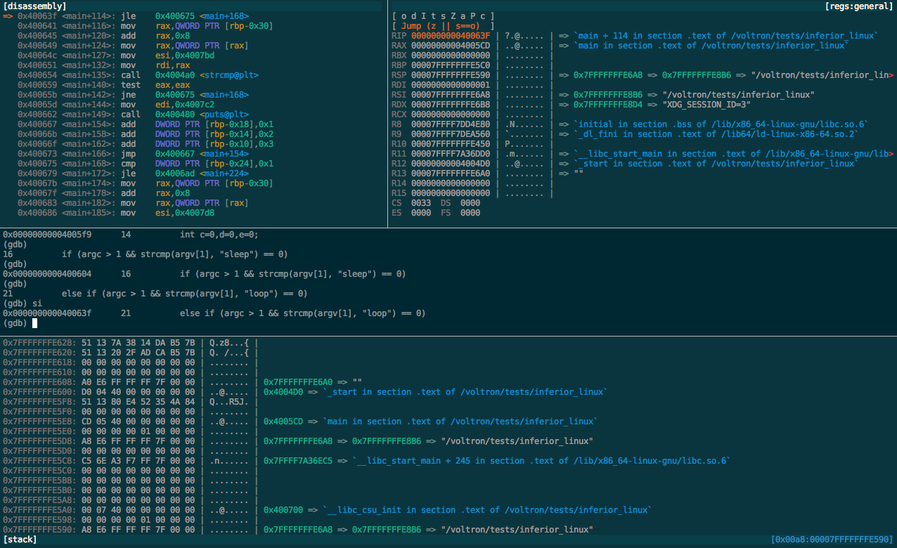 $ voltron view register $ voltron view stack $ voltron view disasm $ voltron view backtrace -