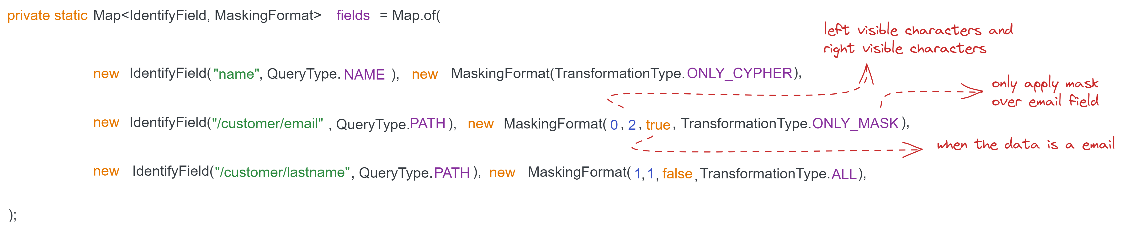 public class Customer { @Mask(rightVisible=4, queryOnly=false, format=DataMaskingConstants.ENCRYPTION_AS_OBJECT) public String creditCardNumber; } Customer c = new Customer(); c.creditCardNumber = "1111222233334444"; String json = objectMapper.writeValueAsString(c); assert json.equals("{ \"creditCardNumber\": { \"masked\": \"***************4444\", \"enc\": \"<credit card encrypted value>\" } }")
