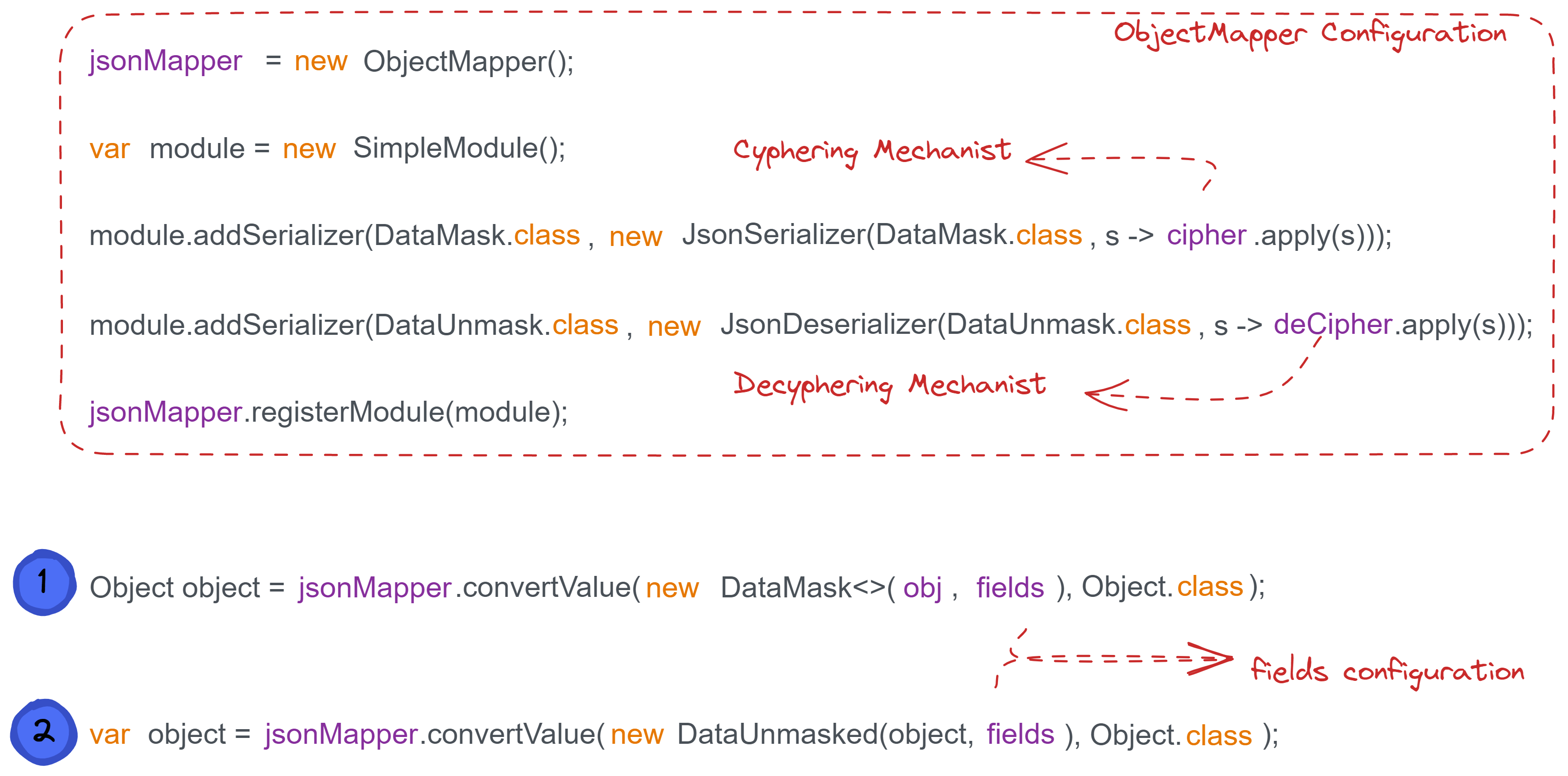 };This library defines a custom ObjectMapper in order to provide the masking and unmasking functionality, and takes