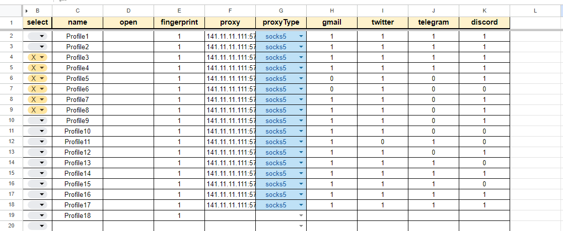 This table serves as a database for the application. Information from the cells is used to open the browser, such as profile name and proxy settings.