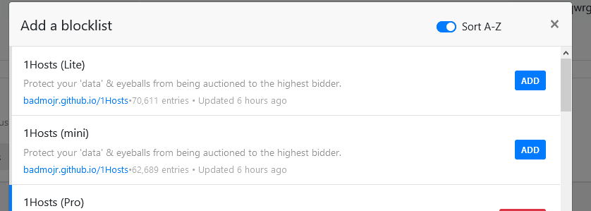 Sort alphabetically the list of blocklists in the "Add a blocklist" screen