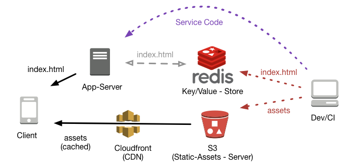 The TL;DR of the talk is that you want to serve your bootstrap index.html that Ember-CLI builds for you from a Key-Value store via your Backend and serve the rest of your assets from a static file hoster like for example S3. This is a sketch of what this Addon gives you out of the box: