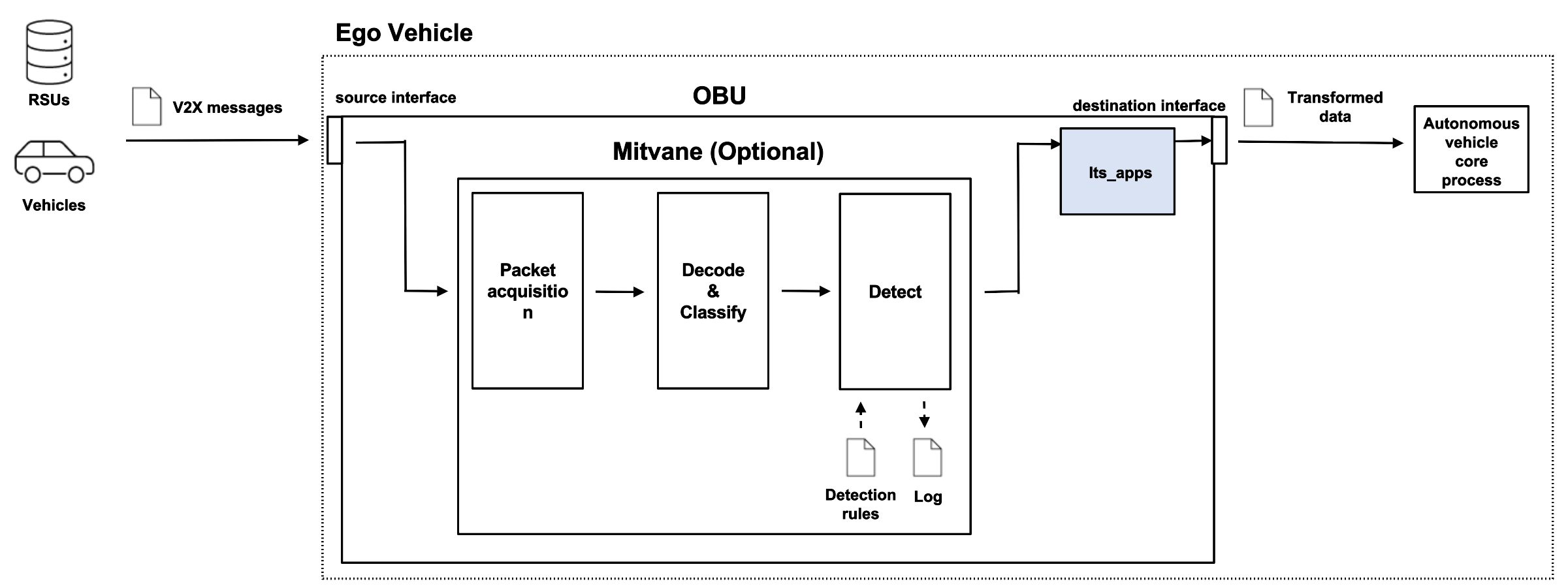 its_apps is assumed to be deployed at OBU. The IDS/IPS (mitvane is optional. When mitvane is deployed, the source interface should be the destination interface of Mitvane. When mitvane is not deployed, the source interface should be the interface which captures V2X messages.