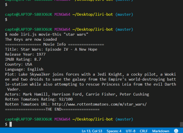 LIRI is like iPhone's SIRI, however, while SIRI is a Speech Interpretation and Recognition Interface, LIRI is a Language Interpretation and Recognition Interface. LIRI is be a command line node app that takes in on of four parameters and returns the relative data.