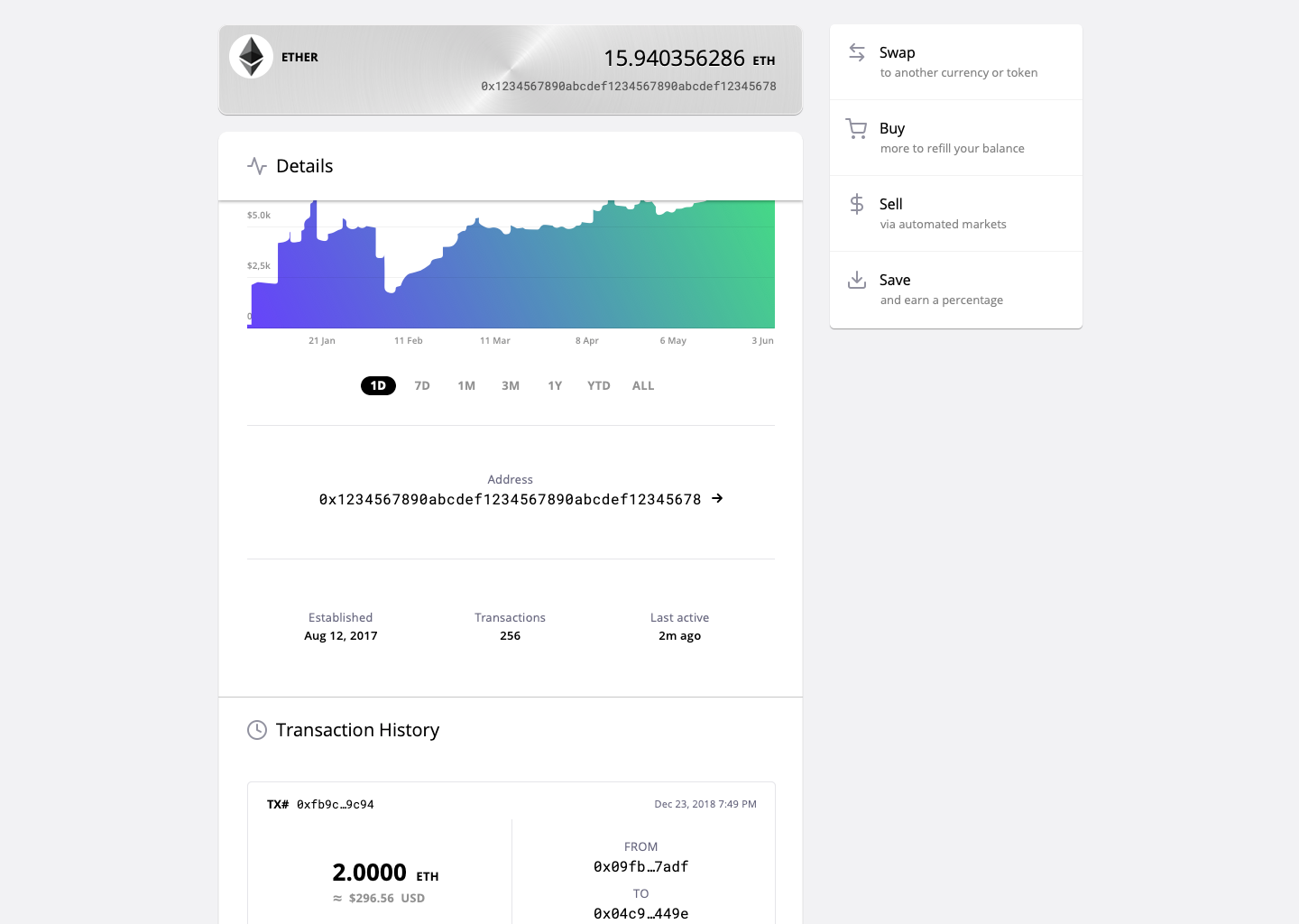 Address's main info and balance are displayed in the header that visually styled similar to the card's embedded view.