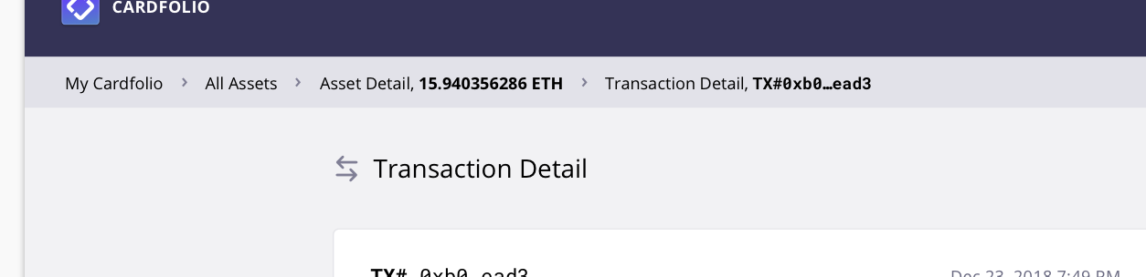 As user navigates through assets and transactions within cardfolio without returning to the overview screen or one of main categories, we should create breadcrumbs and display then at the top of the asset details/transaction details screen (isolated views only).